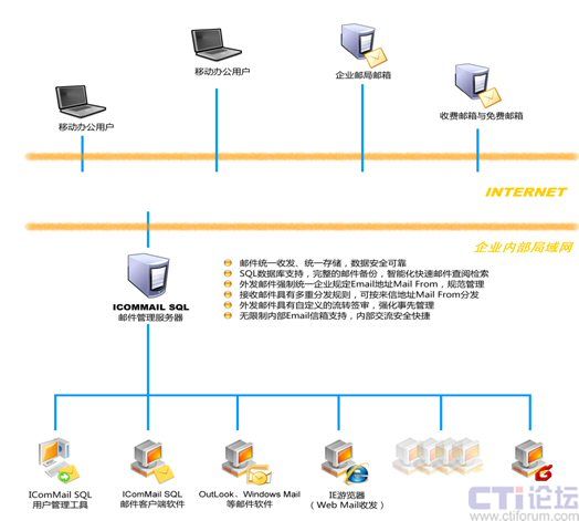 IComMail SQL企業(yè)郵件管理系統(tǒng)是埃康軟件推出的優(yōu)秀的郵件管理軟件,自2003年首推自今已有5年的發(fā)展歷史,系統(tǒng)設(shè)計先進、功能獨特完整、運行穩(wěn)定可靠,在國內(nèi)已有大批裝機用戶,其中以外貿(mào)、進出口等外向型企業(yè)為主要用戶群,廣大用戶已經(jīng)獲得了極大的受益。IComMail SQL系統(tǒng)主推的是其強大的郵件管理功能,與通常的郵件服務器Mail Server系統(tǒng)有著根本的區(qū)別,也有別于日趨流行的企業(yè)郵局服務,IComMail SQL系統(tǒng)是建立在通常的郵件服務器Mail Server或企業(yè)郵局的應用基礎(chǔ)上的,在企業(yè)局域網(wǎng)內(nèi)設(shè)立一IComMail郵件管理服務器,并采用穩(wěn)定可靠的SQL數(shù)據(jù)庫系統(tǒng)作為支撐,為企業(yè)建立安全可靠的企業(yè)郵件數(shù)據(jù)中心,并在此基礎(chǔ)上,擴展了很多高級的企業(yè)郵件管理功能,使企業(yè)的郵件應用水平有質(zhì)的提升。