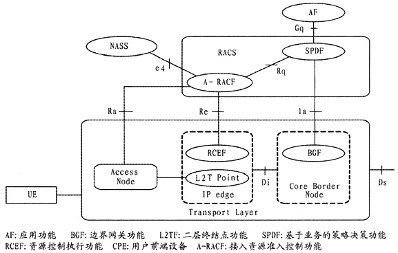 RACS是NGN的組成部分之一,將業(yè)務(wù)層的資源需求與網(wǎng)絡(luò)承載層的資源分配相關(guān)聯(lián),主要完成策略控制、資源預(yù)留、接納控制、網(wǎng)絡(luò)地址轉(zhuǎn)換(NAT)和防火墻穿越等功能。RACS通過一系列策略為應(yīng)用提供基于傳輸?shù)目刂品⻊?wù),只要該應(yīng)用支持RACS接口,RACS就能保證任意應(yīng)用能夠請求到與其服務(wù)相匹配的傳輸資源。同時(shí),RACS為運(yùn)營商提供多種不同接納控制的方法,并設(shè)置各自的承載服務(wù)策略。RACS為各種服務(wù)提供獲得網(wǎng)絡(luò)資源的方法,使得用戶終端可以獲得所提供服務(wù),其總體功能結(jié)構(gòu)如圖3所示[5]。