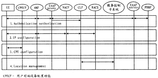 AMF負(fù)責(zé)翻譯UE的接入請求,將UE的IP地址分配請求以及網(wǎng)絡(luò)配置參數(shù)請求轉(zhuǎn)發(fā)至NACF,將用戶鑒權(quán)請求轉(zhuǎn)發(fā)給用戶接入鑒權(quán)功能(UAAF),反向則將來自NACF或UAAF的響應(yīng)轉(zhuǎn)發(fā)給UE。