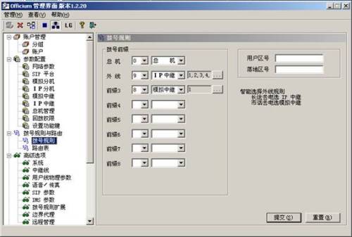 IP PBX 進行配置(如圖)。人機界面簡潔易懂,即便是不懂通訊的外行人,在看過說明書后也能輕松自如地使用。配置起來簡單,例如選擇外線撥號前綴號、做呼叫中心時的ACD輪循分機線路輪循、回撥等,僅僅選下數(shù)字點下提交,幾秒內就可配置結束。