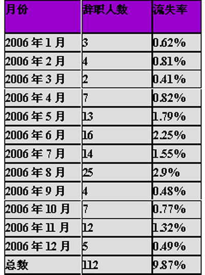 在進行收集、分析一些客服中心資料的過程中,與相關(guān)領(lǐng)導(dǎo)人員進行較深入的思想碰撞,尤其是與中國移動江蘇省客服中心副總經(jīng)理張立春的交流,尤為深刻。一組數(shù)據(jù)深深的震撼著我的思想,一是離職率2006年,僅為:9.87%,遠遠好于整個行業(yè)的平均水平;二是員工的心理健康和壓力狀況遠遠好于全國的平均水平;三是客戶服務(wù)質(zhì)量保持行業(yè)領(lǐng)先地位,各項指標具體數(shù)值陳述如下。
