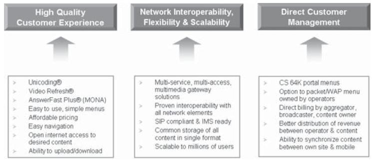 雖然視頻和多媒體服務(wù)的突然火熱對(duì)消費(fèi)者、企業(yè)和業(yè)界來(lái)說(shuō)都是件好事,但存在的挑戰(zhàn)還是很多,如怎樣提供高質(zhì)量的用戶體驗(yàn)、解決手機(jī)和網(wǎng)絡(luò)可互操作性問(wèn)題,以及集成商、廣播媒體和內(nèi)容提供商的直接用戶接觸與管理問(wèn)題。這些問(wèn)題的主要技術(shù)解決方案提供者有Unicoding、Video Refresh和AnswerFast Plus (MONA的一部分),同時(shí)多媒體網(wǎng)關(guān)解決方案也包括在內(nèi)。其它方面的可互操作性和用戶體驗(yàn)改善問(wèn)題很容易能解決,對(duì)今天現(xiàn)有的WAP服務(wù)是一種補(bǔ)充。