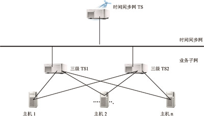 四川電信時間同步網對數據網元的授時,統(tǒng)一采用設置三級時間服務器方式。該方式須在數據網元內部選定一臺或兩臺機器作為三級TS,三級TS同步到時間同步網的時間服務器,系統(tǒng)內的其他主機與三級TS保持同步,如圖2所示。