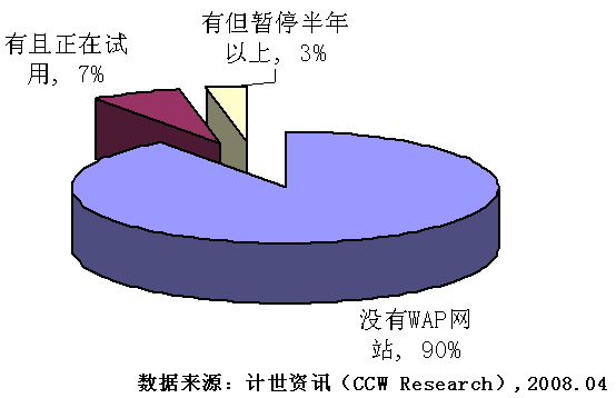 2008年3月至4月,計世資訊(CCW Research)就企業(yè)WAP網(wǎng)站建設(shè)情況對北京71家企業(yè)進行調(diào)研,這些企業(yè)大多分布在互聯(lián)網(wǎng)、IT、電信等行業(yè)。從調(diào)研結(jié)果來看,企業(yè)WAP應用還處于初級階段,71家企業(yè)中只有7家擁有自己的WAP網(wǎng)站,其中有兩家企業(yè)的WAP網(wǎng)站已經(jīng)暫停使用超過了半年。接受訪談的71家企業(yè)無一例外的都有自己的WEB網(wǎng)站,與企業(yè)WEB網(wǎng)站相比,企業(yè)WAP網(wǎng)站普及程度還很低。