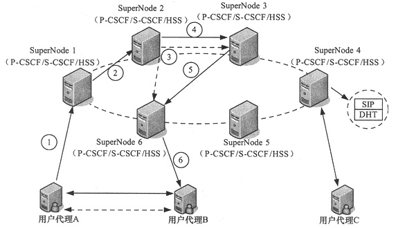 。2)SuperNodel收到用戶代理A的會(huì)話建立請求后,執(zhí)行P-CSCF功能,根據(jù)注冊過程中確定的綁定關(guān)系,把會(huì)話請求路由到主叫用戶歸屬的SuperNode2上。