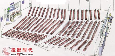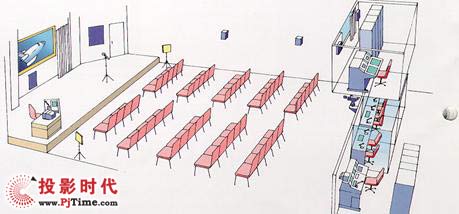 實例三:采用吊掛的投影機(jī)、電動投影幕布、功放音響系統(tǒng)