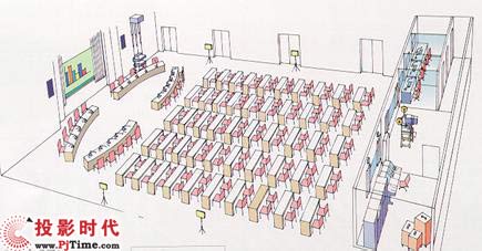 大型會議室考慮需要接入多種信號源,如視頻會議系統(tǒng)、VHS錄象機(jī)、DVD播放機(jī),等等,會議擴(kuò)聲系統(tǒng)要進(jìn)行語言、其它影音資料音頻信號的重播,在設(shè)計時重點考慮揚(yáng)聲器的分布以及聲壓覆蓋的均勻,保證各種音頻信號重播清晰不混濁。