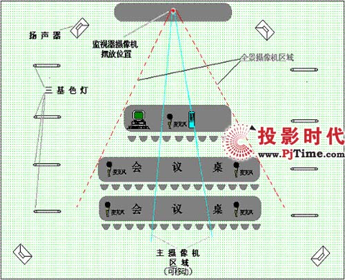 攝像機(jī)放置的最佳位置應(yīng)與監(jiān)視器的位置基本相同,揚(yáng)聲器的位置可放置在會議室的四角,實際中常常是掛在四周的墻上。