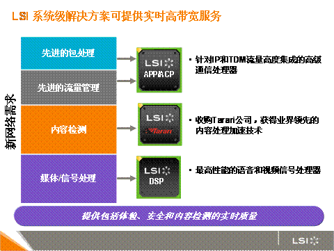 目前,只有很少的技術(shù)專家能夠向移動(dòng)運(yùn)營商提供推出這些新服務(wù)所需要的世界級(jí)解決方案。因?yàn)檫@需要技術(shù)提供者在通信網(wǎng)絡(luò)領(lǐng)域有著深厚的專業(yè)精深技能和高度的系統(tǒng)級(jí)解決方案能力。在通信帶寬和實(shí)時(shí)業(yè)務(wù)提供及系統(tǒng)靈活性存在矛盾時(shí),系統(tǒng)設(shè)計(jì)的挑戰(zhàn)變得至關(guān)緊要。 在其他廠商為解決其中任何之一的技術(shù)問題而忙碌的時(shí)候,世界上有哪個(gè)公司可以利用系統(tǒng)的通信處理器綜合設(shè)計(jì)(包括通信1-7層)將帶寬,實(shí)時(shí)和靈活性三者完美結(jié)合,他便是最終的贏家。LSI就是這些少數(shù)技術(shù)專家之一。它能提供一整套解決方案來提供實(shí)時(shí)高帶寬服務(wù),包括高級(jí)網(wǎng)絡(luò)通信處理器、內(nèi)容檢測(cè)技術(shù)和DSP技術(shù)。