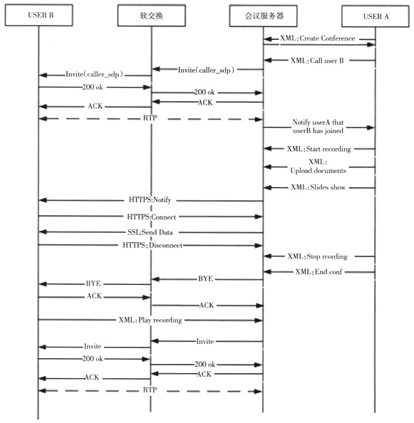 基于上述多媒體會議業(yè)務的實現流程,圖3給出了一個多媒體會議業(yè)務典型應用的信令流程,具體包括對于用戶創(chuàng)建會議、邀請與會成員、會議中的,文件演示、會議的錄制與會議的回放等信令流程的描述。