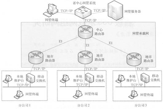 同樣以移動(dòng)網(wǎng)為例,例子中移動(dòng)交換機(jī)到維護(hù)終端支持TCP/IP方式,分公司具有本地維護(hù)終端和網(wǎng)管終端兩種類型的維護(hù)臺(tái)。本地維護(hù)終端通過(guò)以太交換機(jī)直接與移動(dòng)交換機(jī)相連;網(wǎng)元和網(wǎng)管終端通過(guò)以太網(wǎng)接入邊緣路由器,經(jīng)路由器接.el轉(zhuǎn)化以El方式接入到時(shí)隙抽取設(shè)備中,由于傳送網(wǎng)管信息占用帶寬較小,
