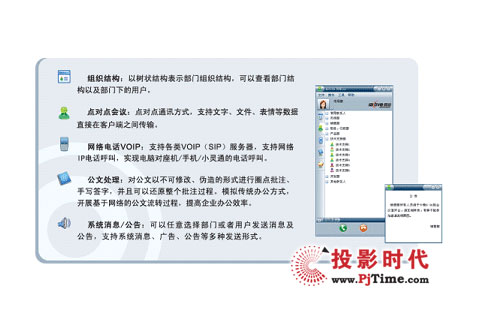 Center運(yùn)營架構(gòu)為基礎(chǔ),有效整合了企業(yè)的如電話、傳真、手機(jī)、短信、E-mail、即時(shí)通訊等各種常用的通信設(shè)備和媒體應(yīng)用,并進(jìn)行統(tǒng)一管理、計(jì)劃及協(xié)同,是一套集即時(shí)通訊、網(wǎng)絡(luò)電話、點(diǎn)對點(diǎn)會議、多方視頻會議、遠(yuǎn)程教學(xué)、遠(yuǎn)程監(jiān)控、組織結(jié)構(gòu)等為一體的桌面融合辦公系統(tǒng),能夠全面滿足企業(yè)遠(yuǎn)程的日常交流、會議培訓(xùn)、協(xié)同辦公、商務(wù)談判、指揮調(diào)度、安全保衛(wèi)等各種需求。