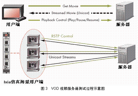 Media Server等業(yè)界常見的視頻服務(wù)器互通并提供性能測(cè)試。圖3是VOD服務(wù)器交換過(guò)程與IXIA進(jìn)行性能測(cè)試示意。