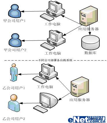傳統(tǒng)軟件是在公司內部架設軟件運行環(huán)境,自己購買應用服務器、數(shù)據(jù)庫服務器、網卡等硬件,安裝自己的局域網并在局域網內部署軟件。所以不同公司都各自部署一套自己的系統(tǒng)。不同公司的用戶事實是通過不同的途徑訪問不同的系統(tǒng),如圖2所示: