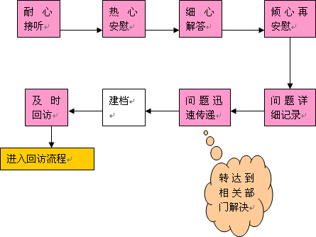 a、 呼叫中心在回訪、投訴應(yīng)答、咨詢應(yīng)答過(guò)程中存在的問(wèn)題,應(yīng)當(dāng)及時(shí)的轉(zhuǎn)遞到相關(guān)的部門(mén)。