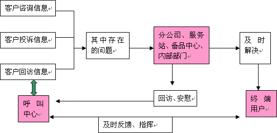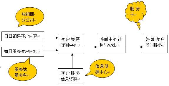 呼叫中心的回訪呼叫工作、咨詢服務(wù)呼叫和問(wèn)題投訴呼叫需要掌握大量的客戶信息資源和公司的產(chǎn)品與服務(wù)政策信息,而這方面的信息需要由客戶購(gòu)車過(guò)程、維修過(guò)程和公司內(nèi)部的相關(guān)部門(mén)提供。