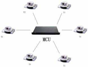 在會議場點數(shù)目不多且地域分布比較集中時,可采用單MCU方式,其組網(wǎng)結(jié)構見圖所示。圖中T1-T6均為視頻會議終端系統(tǒng)設備。