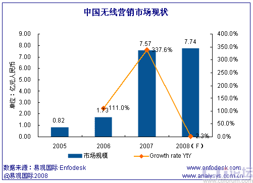 易觀國(guó)際(Analysys International)研究發(fā)現(xiàn),中國(guó)無(wú)線營(yíng)銷市場(chǎng)經(jīng)過(guò)2007年的高速發(fā)展后,2008年已經(jīng)進(jìn)入了商業(yè)模式探索階段,從市場(chǎng)規(guī)模上看,2008年全年無(wú)線營(yíng)銷市場(chǎng)規(guī)模僅比上年增長(zhǎng)2.3%。易觀國(guó)際(Analysys International)認(rèn)為,無(wú)線營(yíng)銷市場(chǎng)增速的明顯放緩主要由于短信廣告市場(chǎng)的萎縮,短信廣告是無(wú)線營(yíng)銷市場(chǎng)最大的細(xì)分領(lǐng)域,2007年曾經(jīng)占整個(gè)無(wú)線營(yíng)銷市場(chǎng)規(guī)模的72.7%。