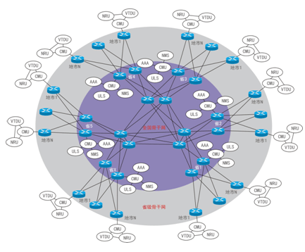 全國骨干網(wǎng)用于承載跨省監(jiān)控業(yè)務(wù)的媒體及信令傳送,省級骨干網(wǎng)用于承載跨地市監(jiān)控業(yè)務(wù)的媒體及信令傳送。全國骨干網(wǎng)與省級骨干網(wǎng)的網(wǎng)絡(luò)承載模型如下圖所示: