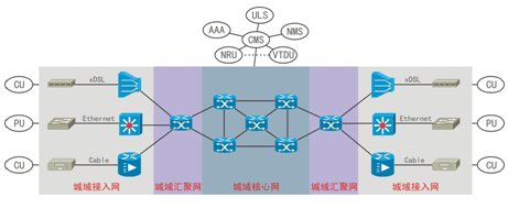 城域網(wǎng)包括核心層、匯聚層以及接入層,主要用于承載本域PU、CU與本域中心服務(wù)平臺之間的媒體及信令傳送。城域網(wǎng)的網(wǎng)絡(luò)承載模型如下圖所示: