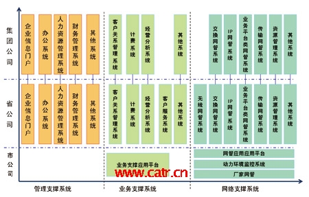 從系統(tǒng)部署來看,目前各大運營企業(yè)都以集團與省公司為主要的建設(shè)與管理維護單位,建成了集團與省兩級模式的支撐系統(tǒng)。集團公司的系統(tǒng)主要提供面向全公司的企業(yè)管理、經(jīng)營分析等功能;省公司從職能管理單位逐步轉(zhuǎn)向了兼顧管理、生產(chǎn)的單位,具有了越來越多的生產(chǎn)職能,在運營支撐系統(tǒng)建設(shè)中的作用較為突出,一般情況下,在遵循集團公司的總體指導(dǎo)思想下,可自行規(guī)劃與建設(shè)本省的支撐系統(tǒng);市公司的生產(chǎn)職能有所削弱,主要負(fù)責(zé)市場營銷、客戶支撐以及設(shè)備的現(xiàn)場維護等工作,因而主要是支撐系統(tǒng)的使用單位。