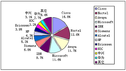 賽迪顧問預測,2009年中國統(tǒng)一通信市場中,在通信設(shè)備領(lǐng)域,Cisco市場份額將達到16.8%,繼續(xù)保持領(lǐng)頭樣的位置,而且市場份額有望繼續(xù)增加,Nortel和Avaya緊隨其后,市場份額分別將達到12.6%和11.7%。而在軟件廠商方面,Microsoft和IBM將繼續(xù)保持市場領(lǐng)先地位,市場份額分別將達到11.6%和9.7%,增長勢頭強勁。其它市場份額較大的國外統(tǒng)一通信廠商還有西門子、阿爾卡特、愛立信、HP等。在國內(nèi)方面,中興和H3C分別以約3%的市場份額占據(jù)領(lǐng)先位置。