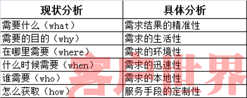 明辨客戶需求,是提升客戶體驗(yàn)的基礎(chǔ)。目前很多語音搜索號(hào)碼大多根據(jù)客戶對(duì)業(yè)務(wù)需求的不同,推出了不同的專業(yè)延伸服務(wù),并取得了很好的成效。由于使用移動(dòng)語音搜索的客戶在使用搜索時(shí)的環(huán)境、時(shí)間、地點(diǎn)有所不同,我們需要結(jié)合這些要素,對(duì)客戶需求進(jìn)行深入分析,以保證呼叫中心能夠提供更好的客戶體驗(yàn)。下文將采用5W1H分析法,對(duì)移動(dòng)語音搜索時(shí)客戶需求的特點(diǎn)進(jìn)行分析。