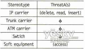 針對(duì)圖1中定義的定型以及對(duì)網(wǎng)絡(luò)安全構(gòu)成威脅的攻擊者的類(lèi)型,可以定義出威脅函數(shù)TheatA(s)。其中A表示攻擊者類(lèi)型,這里假定攻擊者為具備一般能力的外部攻擊者,即其可以竊聽(tīng)到廣播信道上的數(shù)據(jù)流量,并可以插入或刪除數(shù)據(jù)流量,能夠利用系統(tǒng)漏洞入侵系統(tǒng);表示為模型中定義的定型威脅函數(shù)的值域?yàn)閧delete,read,insert,access}。根據(jù)NGN中承載網(wǎng)絡(luò)和計(jì)算節(jié)點(diǎn)的特性,我們可以得出如下威脅函數(shù),如表1所示。