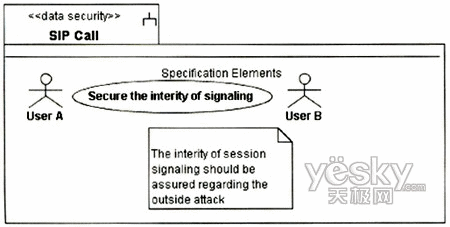 圖3中的UA代表UserA或UserB的UA,因?yàn)閮蓚(gè)UA的信令交互需要通過(guò)Proxy,且其安全需求是一致的,故在圖中只表現(xiàn)出一方。UA和Proxy均是基于通用計(jì)算平臺(tái)的節(jié)點(diǎn),其訪問(wèn)控制需要受到保護(hù),故對(duì)其標(biāo)記上定型《guardedaccess》。UA中除處理信令外,還需處理媒體流的編解碼與控制,這個(gè)用例中只涉及信令的安全性,故在UA中只關(guān)注進(jìn)行信令控制的組件。UA與Proxy之間的通信基于IP承載,根據(jù)表1定義的威脅函數(shù):ThreatA(IP