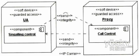 下面以基于SIP的兩方會(huì)話為例說(shuō)明如何使用UMLsec描述業(yè)務(wù)安全需求。假定兩方呼叫發(fā)生在同一SIPProxy轄域的兩個(gè)用戶(hù)之間,要求保證用戶(hù)UA與SIPProxy之間的信令的完整性,不能被非法入侵者篡改。該場(chǎng)景的用例圖和部署圖分別如圖2、圖3所示。