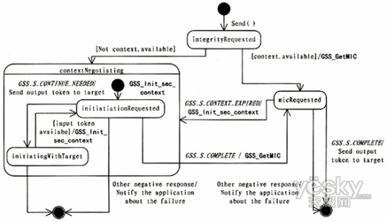 下面說(shuō)明如何利用GSS-API實(shí)現(xiàn)保證通信完整性的安全能力抽象類(lèi),通過(guò)狀態(tài)圖說(shuō)明保證通信完整性的Sender類(lèi)的send()方法及Receiver類(lèi)的receive()方法的GSS-API實(shí)現(xiàn)。本文中給出的是一個(gè)示意性的說(shuō)明,忽略了一些錯(cuò)誤處理過(guò)程。