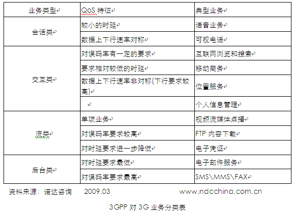3GPP作為3G標(biāo)準(zhǔn)的研究組織,根據(jù)業(yè)務(wù)內(nèi)在技術(shù)要求把3G業(yè)務(wù)分成四類,主要包括會(huì)話類業(yè)務(wù)、交互類業(yè)務(wù)、流類業(yè)務(wù)、后臺(tái)類業(yè)務(wù)。此種劃分方法主要關(guān)注的是業(yè)務(wù)的技術(shù)質(zhì)量保證,對(duì)業(yè)務(wù)應(yīng)用、業(yè)務(wù)場景、業(yè)務(wù)對(duì)生活的影響關(guān)注較少,但這種分類可以清晰的體現(xiàn)業(yè)務(wù)最底層的技術(shù)要求及業(yè)務(wù)與網(wǎng)絡(luò)相互影響。