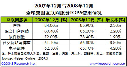 iResearch艾瑞咨詢根據NielsenOnline公布的全球范圍內排名前五位的互聯(lián)網服務使用情況發(fā)現(xiàn),2008年在全球范圍內,社交網絡與博客的發(fā)展最為迅速。數據顯示,在包括搜索、綜合門戶網站、軟件制造、社交網絡與博客以及電子郵件在內的五項互聯(lián)網服務中,相對2007年12月,2008年12月社交網絡與博客的使用情況增長率最高,達8.8%。而搜索、綜合門戶網站、軟件制造的增長率,分別為2.3%、2.2%、1.9%,均不足社交網絡與博客增長率的二分之一。高增長帶動社交網絡與博客服務在2008年12月以66.8%的使用率反超電子郵件(65.1%),躍居TOP5網絡服務第四位。