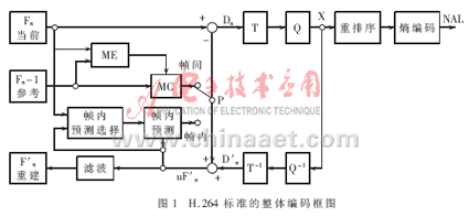 Abstraction Layer),負(fù)責(zé)對數(shù)據(jù)進(jìn)行打包和傳送。H.264編碼圖像通常分為三種類型:I幀、P幀、B幀。I幀為幀內(nèi)編碼幀,其編碼不依賴于已編碼的圖像數(shù)據(jù)。P幀為前向預(yù)測幀,B幀為雙向預(yù)測幀,編碼時都需要根據(jù)參考幀進(jìn)行運(yùn)動估計(jì)。同時,H.264在提高圖像傳輸容錯性方面做了大量工作,重新定義了適于圖像的結(jié)構(gòu)劃分。在編碼時,圖像幀各部分被劃分到多個Slice結(jié)構(gòu)中,每個Slice都可以被獨(dú)立編碼,不受其他部分影響。Slice由圖像最基本的結(jié)構(gòu)——宏塊組成,每個宏塊包含一個16×16的亮度塊和兩個8×8的色度塊。H.264標(biāo)準(zhǔn)的整體編碼框圖如圖1所示。編碼過程中,原始數(shù)據(jù)進(jìn)入編碼器后,當(dāng)采用幀內(nèi)編碼時,首先選擇相應(yīng)的幀內(nèi)預(yù)測模式進(jìn)行幀內(nèi)預(yù)測,隨后對實(shí)際值和預(yù)測值之間的差值進(jìn)行變換、量化和嫡編碼,同時編碼后的碼流經(jīng)過反量化和反變換之后重構(gòu)預(yù)測殘差圖像,再與預(yù)測值相加得出重構(gòu)幀,得出的結(jié)果經(jīng)過去塊濾波器平滑后送入幀存儲器。采用幀間編碼時,輸入的圖像塊首先在參考幀中進(jìn)行運(yùn)動估計(jì),得到運(yùn)動矢量。運(yùn)動估計(jì)后的殘差圖像經(jīng)整數(shù)變換、量化和嫡編碼后與運(yùn)動矢量一起送入信道傳輸。同時另一路碼流以相同的方式重構(gòu)后,經(jīng)去塊濾波后送入幀存儲器作為下一幀編碼的參考圖像。