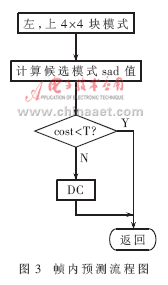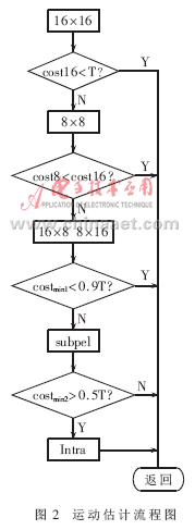 (4)算法替代和改進(jìn)。幀間預(yù)測的改進(jìn):關(guān)于算法的改進(jìn)主要集中在對me(motion estimation)的改進(jìn)上,流程如圖2所示。costmin1=min(cost16,cost8,cost16×8,cost8×16),costmin2=min(costmin1,costsub),依次在16×16、8×8、16×8和8×16大小宏塊的整像素位置做預(yù)測,再做次像素估計(jì)和幀內(nèi)預(yù)測,選用匹配準(zhǔn)則函數(shù)(采用sad作為匹配準(zhǔn)則函數(shù))取得最小值的模式進(jìn)行編碼。每計(jì)算一種模式,都將sad值與一個經(jīng)驗(yàn)閥值做比較。當(dāng)sad值小于這個閥值時,立即結(jié)束運(yùn)動估計(jì),從而減少運(yùn)算量。
