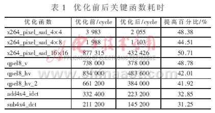和SRAM 進(jìn)行擴(kuò)展,可以訪問多達(dá)132 MB的物理存儲器。根據(jù)這樣的特點(diǎn),將執(zhí)行率更高的代碼放入L1指令緩存中,能使代碼更快地運(yùn)行。IDE提供了Profile工具,能在運(yùn)行時統(tǒng)計(jì)各個函數(shù)所占的CYCLE數(shù)和占總CYCLE數(shù)的百分比。通過將X264中比較耗時的部分算法代碼,如模式選擇部分代碼放入L1指令空間,能進(jìn)一步提升運(yùn)行效率。Profile工具統(tǒng)計(jì)結(jié)果同樣也是選擇需要使用匯編優(yōu)化函數(shù)的依據(jù),IDE可根據(jù)Profile結(jié)果對代碼進(jìn)行優(yōu)化。X264代碼Profile統(tǒng)計(jì)結(jié)果與測試數(shù)據(jù)有很大關(guān)系,選用更類似以后應(yīng)用場所的數(shù)據(jù)作為測試數(shù)據(jù),能使統(tǒng)計(jì)結(jié)果更接近以后的應(yīng)用環(huán)境。為達(dá)到比較準(zhǔn)確的統(tǒng)計(jì)結(jié)果,最好在Simulation階段進(jìn)行統(tǒng)計(jì)。雖然這樣非常耗時,但為得到一個準(zhǔn)確的統(tǒng)計(jì)作為參考依據(jù)是值得的。此外CACHE