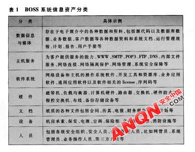 BOSS系統(tǒng)涉及的信息繁多,如何保護(hù)關(guān)鍵的數(shù)據(jù)不被泄漏是運營商非常重視的一個問題。信息分級用來評估運營商是否建立了信息資產(chǎn)管理的規(guī)范,明確了信息資產(chǎn)的內(nèi)容和級別,制定了有效的安全保護(hù)措施,如果沒有,應(yīng)該明確BOSS系統(tǒng)內(nèi)的關(guān)鍵信息資產(chǎn)并列出清單,依據(jù)國家保密級別制定科學(xué)的信息資產(chǎn)分級標(biāo)準(zhǔn),并作為風(fēng)險評估的依據(jù)。參照國際信息系統(tǒng)安全標(biāo)準(zhǔn)BS7799/ISO17799對信息資產(chǎn)的描述和定義,可以將BOSS系統(tǒng)信息資產(chǎn)按照表1的方法進(jìn)行分類。