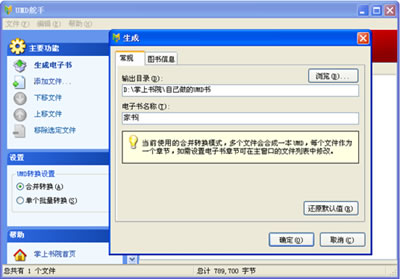 點(diǎn)擊“添加文件”,將你想要轉(zhuǎn)換的電子書添加至軟件窗口,大批量轉(zhuǎn)換的用戶可一次性選中多個(gè)文件添加,添加完畢后,你可以隨時(shí)通過“上移文件”和“下移文件”按鈕來調(diào)整你文件擺放的位置,或者移除不需要轉(zhuǎn)換的文件。確認(rèn)后,選擇合并轉(zhuǎn)換或是單個(gè)批量轉(zhuǎn)換,合并轉(zhuǎn)換是將添加的文件合并成一本UMD電子書,單個(gè)批量轉(zhuǎn)換是每個(gè)文件生成一本UMD電子書。設(shè)置完后點(diǎn)擊“生成電子書”,在彈出的對(duì)話框中設(shè)置輸出目錄、電子書名稱、電子書封面、作者、來源后點(diǎn)擊確認(rèn),出現(xiàn)正在轉(zhuǎn)換的進(jìn)度條,完成制作后會(huì)自動(dòng)打開電子書所在的目錄,你的電子書制作完成,是不是非常簡(jiǎn)單。