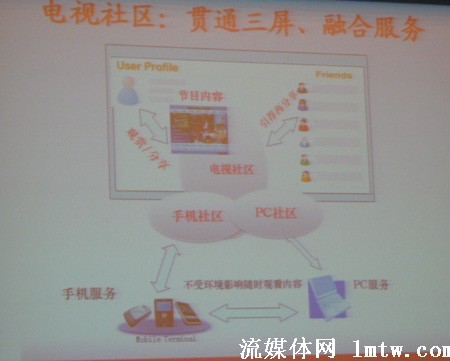 百視通在數(shù)月前便發(fā)布了三屏融合戰(zhàn)略,據(jù)李川介紹,百視通是從節(jié)目分享開始著手的。比如發(fā)一個片花到手機(jī)上,用戶喜歡的話可以定制,IPTV上設(shè)一個入口,兩相對接,用戶點(diǎn)一兩個鍵就可以很方便的看到他需要的視頻,從而解決了不斷翻頁造成用戶流失的問題。而在電腦上,也可以實(shí)現(xiàn)這樣的定制,甚至是異地傳送。亦即即使出差在外地,也可以很簡單的通過互聯(lián)網(wǎng)定制IPTV節(jié)目送給家人、朋友。