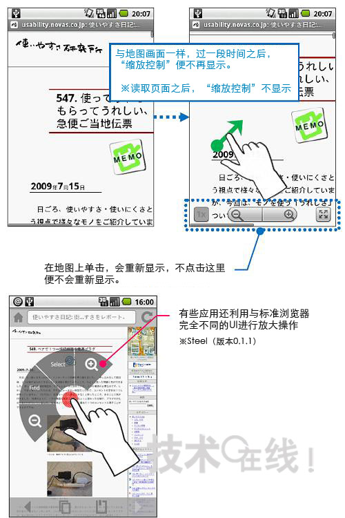 圖片說明: 利用不同操作調(diào)出同一工具為在Android的標準瀏覽器(上面的兩個畫面)上調(diào)出縮放畫面顯示的工具(縮放控制),用手指拖拽畫面(向一個方面滑動)。為利用地圖應(yīng)用軟件調(diào)出同一工具,需要輕敲畫面(敲擊)能從在Android市場上下載的瀏覽器(下面的畫面)有能夠利用完全不同的UI縮放畫面的工具。