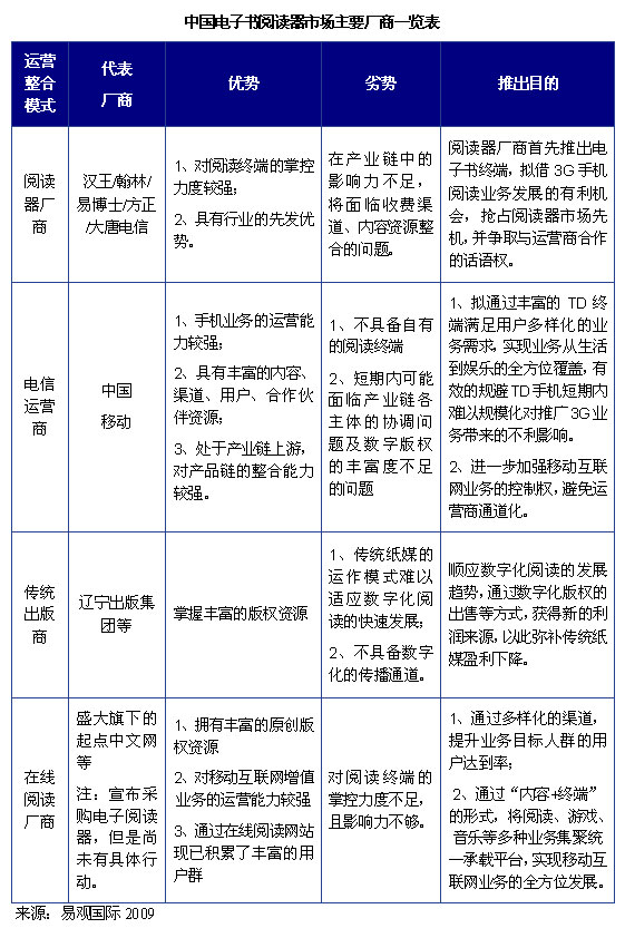 International)分析認(rèn)為,目前中國電子書市場(chǎng)以閱讀器廠商及電信運(yùn)營(yíng)商兩種力量為主導(dǎo),此外還包括傳統(tǒng)出版商、在線閱讀廠商等其他力量。對(duì)現(xiàn)有各種運(yùn)營(yíng)模式的企業(yè)分析如下: