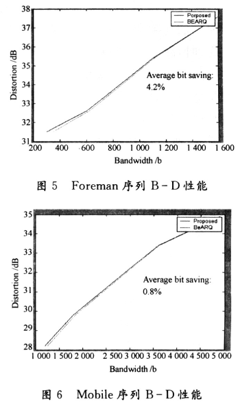 將圖4~圖6對(duì)比可以看出,對(duì)于運(yùn)動(dòng)程度很低且紋理相對(duì)平緩的Akiyo序列來(lái)說(shuō),相對(duì)盡力而為ARQ機(jī)制,本文的機(jī)制在3%的丟包情形下可以節(jié)省20%以上的帶寬。而對(duì)運(yùn)動(dòng)較為劇烈的Foreman序列來(lái)說(shuō),則只能節(jié)省4%的帶寬。對(duì)紋理很復(fù)雜的Mobile序列,本文的算法相對(duì)于BEARQ,帶寬僅節(jié)省不到1%。從表1的重發(fā)率和圖4~圖6的對(duì)應(yīng)關(guān)系不難看出,重發(fā)率越高,則對(duì)應(yīng)B-D性能的改善程度就越低。因此可以說(shuō)實(shí)驗(yàn)仿真表明了本文提出的傳輸控制算法,能夠在保證視頻接收質(zhì)量的同時(shí),有效降低傳輸所用帶寬。