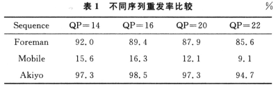 為了更全面評(píng)價(jià)本算法的性能,對(duì)不同測(cè)試序列在同樣丟包率情況下對(duì)本章的機(jī)制進(jìn)行性能測(cè)試。考慮到影響本章算法性能的包括序列的紋理復(fù)雜程度以及運(yùn)動(dòng)劇烈程度。這里利用運(yùn)動(dòng)較為劇烈但紋理相對(duì)較單一的Foreman序列,紋理復(fù)雜程度較高的Mobile以及運(yùn)動(dòng)程度較低的Akiyo序列作為評(píng)測(cè)序列。表1是對(duì)這三個(gè)測(cè)試序列在QP=14,16,20,22,丟包率為3%的情況下前100幀做的統(tǒng)計(jì),其中出錯(cuò)Slice個(gè)數(shù)為24,則出錯(cuò)宏塊總數(shù)為24×11=264。令NMB=264,則根據(jù)模式判決結(jié)果,即可得到對(duì)重發(fā)率的統(tǒng)計(jì)。