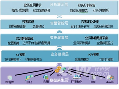 業(yè)務(wù)建模層: 是整個(gè)監(jiān)控系統(tǒng)的核心,是將業(yè)務(wù)進(jìn)行有形化管理、量化衡量的高效手段。該業(yè)務(wù)建模層中涵蓋了幾乎所有的BOSS管理資源要素,包括業(yè)務(wù)、應(yīng)用、服務(wù)及其他平臺(tái)類資源,這些信息都建立并實(shí)時(shí)更新于企業(yè)集中建設(shè)的符合ITIL標(biāo)準(zhǔn)的CMDB(配置資源數(shù)據(jù)庫(kù),其中每一子項(xiàng)便是一個(gè)CI配置資源項(xiàng))中。基于CMDB中動(dòng)態(tài)調(diào)整的實(shí)時(shí)CI項(xiàng)和相互關(guān)系,關(guān)聯(lián)上能夠反映業(yè)務(wù)當(dāng)前狀況的KPI指標(biāo),以結(jié)構(gòu)化的模型框架為指導(dǎo),建立完整的業(yè)務(wù)CI/KPI指標(biāo)體系,繪制出以業(yè)務(wù)為中心的BOSS系統(tǒng)視圖,全面展現(xiàn)其健康度和可用性。