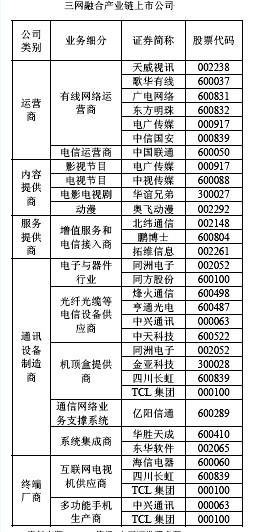機頂盒產(chǎn)業(yè)也將受益。方正證券稱,中國電信(行情,資訊,評論)在多個城市開展IPT V業(yè)務試點首先需要對IPT V機頂盒進行采購,而廣電運營商從標清單到高清再到互動雙向的網(wǎng)絡升級改造也帶來了大量的機頂盒新增需求和更新?lián)Q代需求。同時,“三網(wǎng)融合”重點工作也提出,“要支持三網(wǎng)融合共性技術、關鍵技術、基礎技術和關鍵軟硬件的研發(fā)和產(chǎn)業(yè)化。將“三網(wǎng)融合”相關產(chǎn)品和業(yè)務納入政府采購范圍。隨著有線網(wǎng)絡運營商向電信級運營商轉(zhuǎn)型,低端的設備制造商亦會進行產(chǎn)品和服務升級以依托產(chǎn)業(yè)鏈獲得長久生命力。   軟件提供商同樣將分享蛋糕。方正證券表示,三網(wǎng)融合重點工作要求選擇有條件的地區(qū)開展雙向進入試點、加強網(wǎng)絡建設改造、強化網(wǎng)絡管理。數(shù)據(jù)、增值業(yè)務、節(jié)目等內(nèi)容的發(fā)展會帶來數(shù)據(jù)和交換中心的更新?lián)Q代和升級,也將帶來網(wǎng)絡安全建設的加強,從而給計算機硬件及軟件,特別是軟件中的系統(tǒng)集成業(yè)務帶來發(fā)展。
