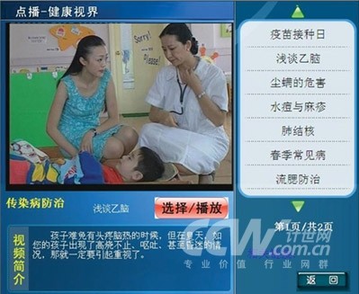 e-Health平臺提供了大量的健康視頻及電子雜志信息,以三網(wǎng)融合的網(wǎng)絡(luò)為基礎(chǔ),通過互動電視、網(wǎng)站、手機(jī)短信(隨著手機(jī)3G的推出,將給居民提供手機(jī)Web和手機(jī)視頻服務(wù))等形式,給居民提供廣覆蓋式的健康教育。同時(shí),該平臺和居民健康檔案集成后,可以根據(jù)居民所處不同時(shí)期、不同的健康狀態(tài),為居民提供個(gè)性化的、有針對性的健康教育內(nèi)容。