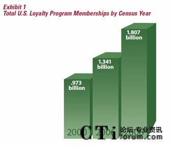 據(jù)權(quán)威的客戶忠誠度研究機(jī)構(gòu)COLLOQUY在2009出版的一份報(bào)告,2008年底,全美客戶忠誠度計(jì)劃的參與人次達(dá)到18.07億,平均每個(gè)美國家庭參與了14.1個(gè)忠誠度計(jì)劃,相較2006年底的13.41億參與人次,共增了了24.73%(連續(xù)兩年環(huán)比增長(zhǎng)12%/年),而同期美國的GDP增長(zhǎng)僅為2.2%。從這一點(diǎn)上看,美國企業(yè)對(duì)忠誠度營銷的熱情不減,盡管忠誠度營銷在美國已相當(dāng)成熟,但美國企業(yè)仍然把它當(dāng)作是營銷的重要工具。