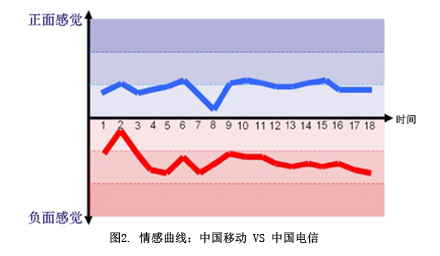 圖2的情感曲線分別是中國移動的“喜愛”情感曲線和中國電信的“討厭”情感曲線,對應于雙方整個呼入電話體驗18個子流程上的情感感受。(注意,我們只列出了中國移動的“喜愛”曲線和中國電信的“討厭”曲線來舉例說明。)