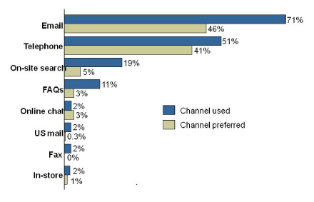 。這個報(bào)告可能有些誤導(dǎo)傾向,因?yàn)樗@示41%的受調(diào)者偏愛電話聯(lián)絡(luò),只有3%選擇聊天。如果將調(diào)研范圍局限在電子零售行業(yè)那么選擇聊天的人數(shù)將大幅上升。事實(shí)上,網(wǎng)站合作供應(yīng)商以及eCare