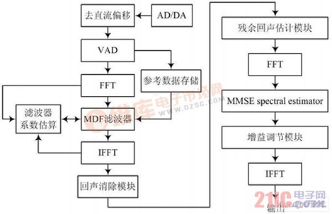 系統(tǒng)采用了頻域的MDF 自適應(yīng)濾波算法,將MMSE No ise Suppresso r 和多個(gè)VAD 添加到回聲消除器中。在加入濾波器系數(shù)更新模塊和非線性檢測模塊后,使得系統(tǒng)在更惡劣的噪音環(huán)境下以及雙方通話過程中,一樣具備良好的回聲消除和噪音消除能力。整個(gè)核心運(yùn)算部分均在頻率域內(nèi)完成,也大大降低了運(yùn)算量,最后通過調(diào)整DSP 的數(shù)據(jù)結(jié)構(gòu),合理運(yùn)用DSP 的資源和指令加速,實(shí)現(xiàn)了基于DSP 的高效能實(shí)時(shí)音頻處理器的設(shè)計(jì)。
